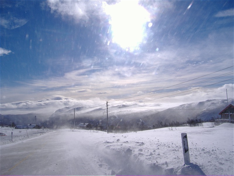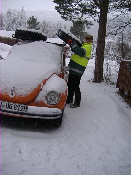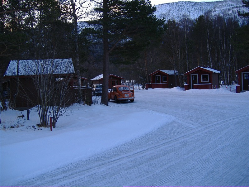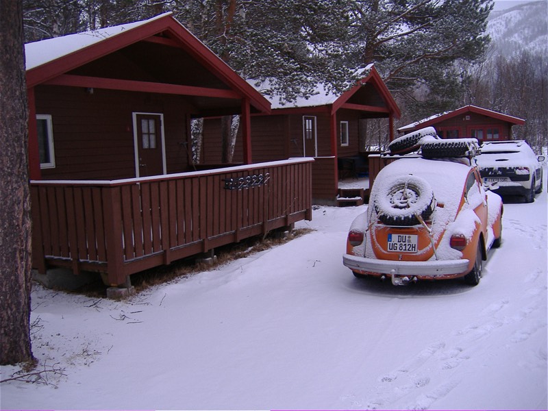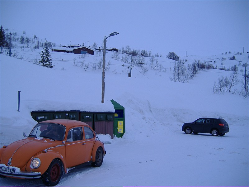 Bei Tageslicht und starken Schneeverwehungen fiel uns auf, dass wir wohl doch über drei Bergpässe gefahren sein müssen bei der Hinfahrt. Ab jetzt weiß ich, warum die Norweger an Trolle glauben. So nachts draußen im Dunkeln um 23:00 Uhr und weiße Landstraßen kam uns die Gegend schon seltsam vor. Wir kamen gut voran, wenn der Käfer uns nicht im Stich lässt, wird es sicherlich eine gute Etappe; weit gefehlt.